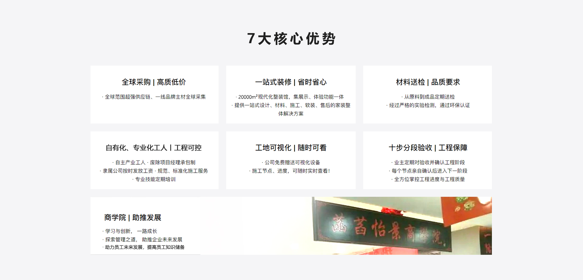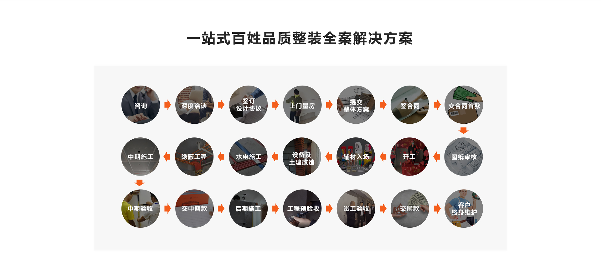 每個(gè)工作人員都需通過(guò)公司專業(yè)系統(tǒng)培訓(xùn)后上崗,從設(shè)計(jì)、簽約、選材、施工到交付,服務(wù)全過(guò)程保障