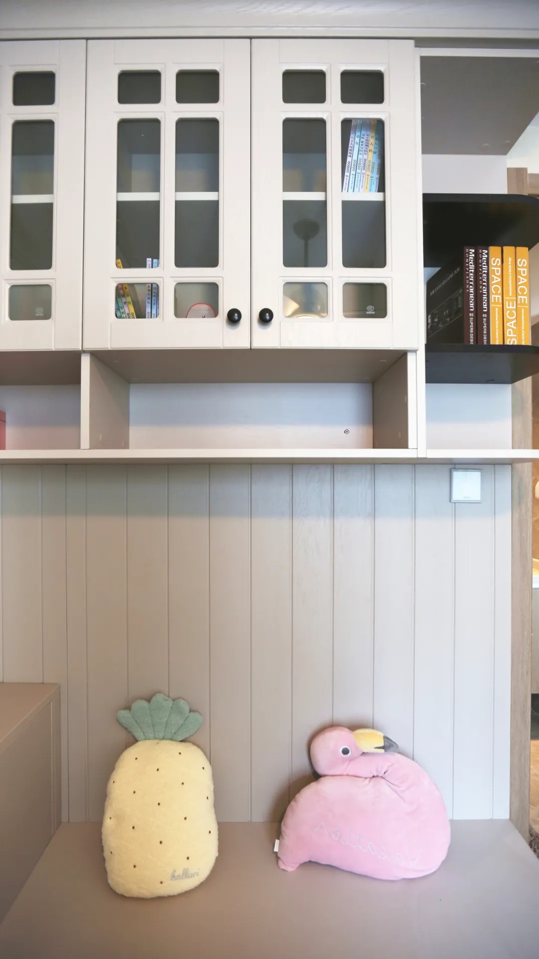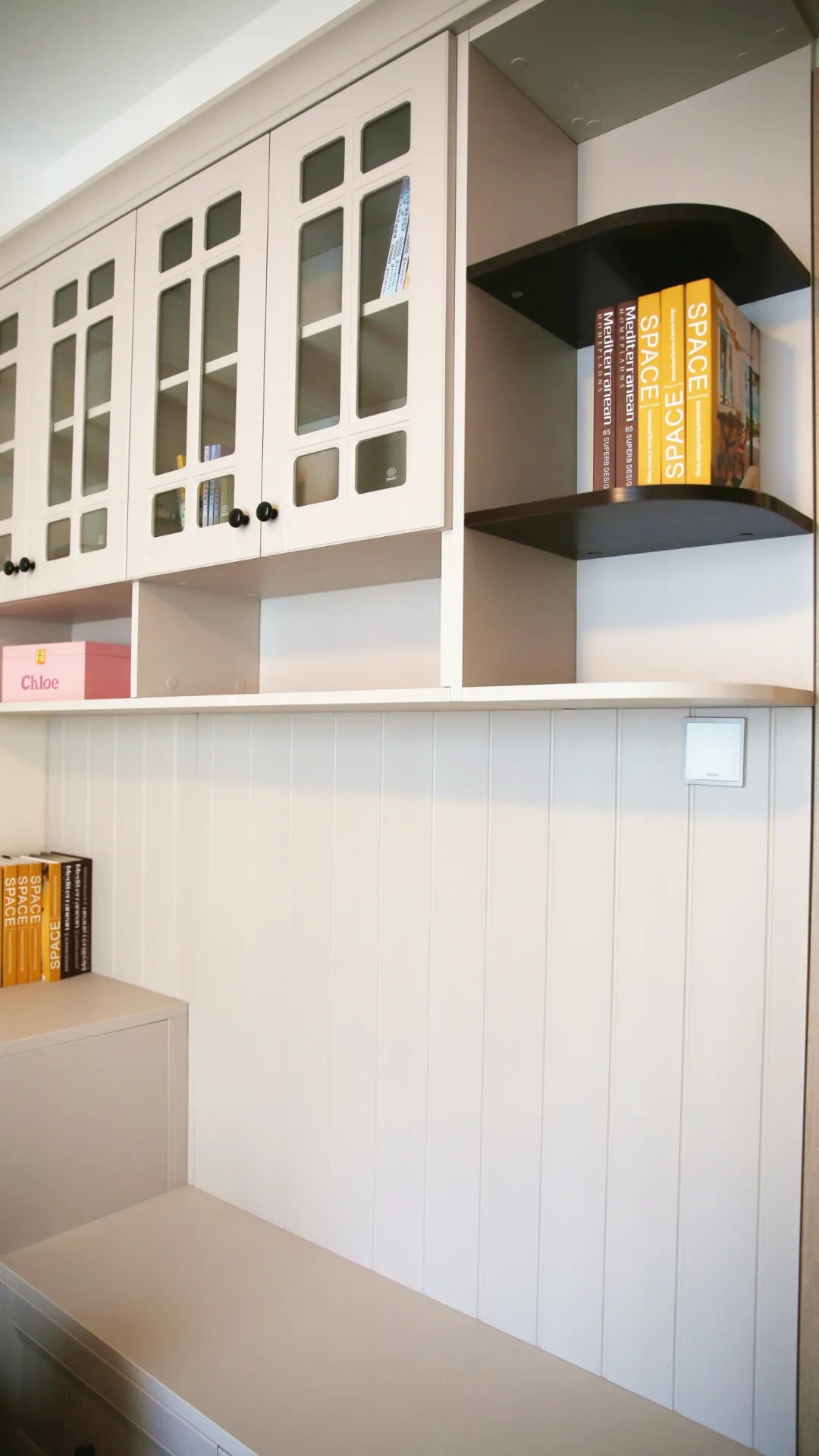 ? 沿墻定制的書桌柜,在墻面設(shè)計(jì)儲(chǔ)物吊柜,透明玻璃的柜門可以遮擋灰塵,也方便孩子翻找書籍,開放式擱板區(qū)域可以放置常用文具。