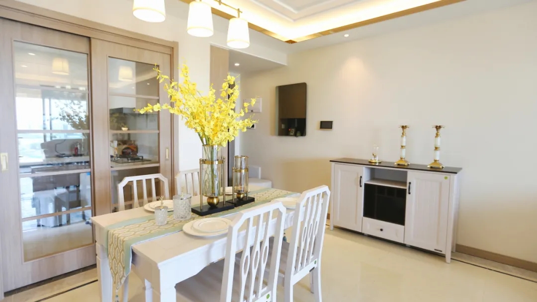 ? 餐廳——簡(jiǎn)約溫馨的用餐空間。作為三代同堂的家庭,餐廳是家人聯(lián)絡(luò)感情的重要場(chǎng)所,所以設(shè)計(jì)師以簡(jiǎn)約木質(zhì)餐桌椅,搭配黃色花藝,營(yíng)造溫馨的用餐氛圍??繅Φ牟瓦吂?,既能擺放紅酒、杯碟等物品,些許裝飾擺件的點(diǎn)綴也能為餐食空間增添別樣的樂趣。