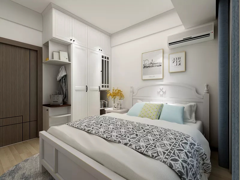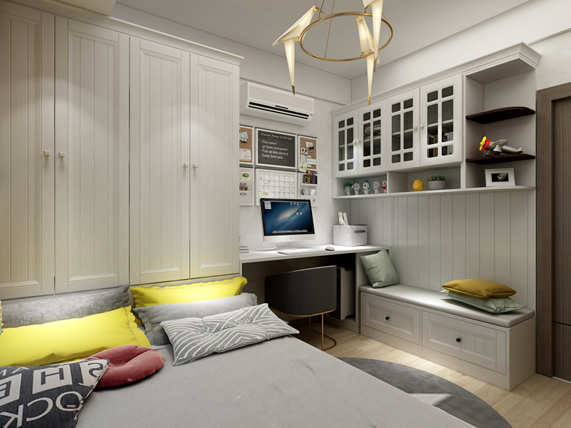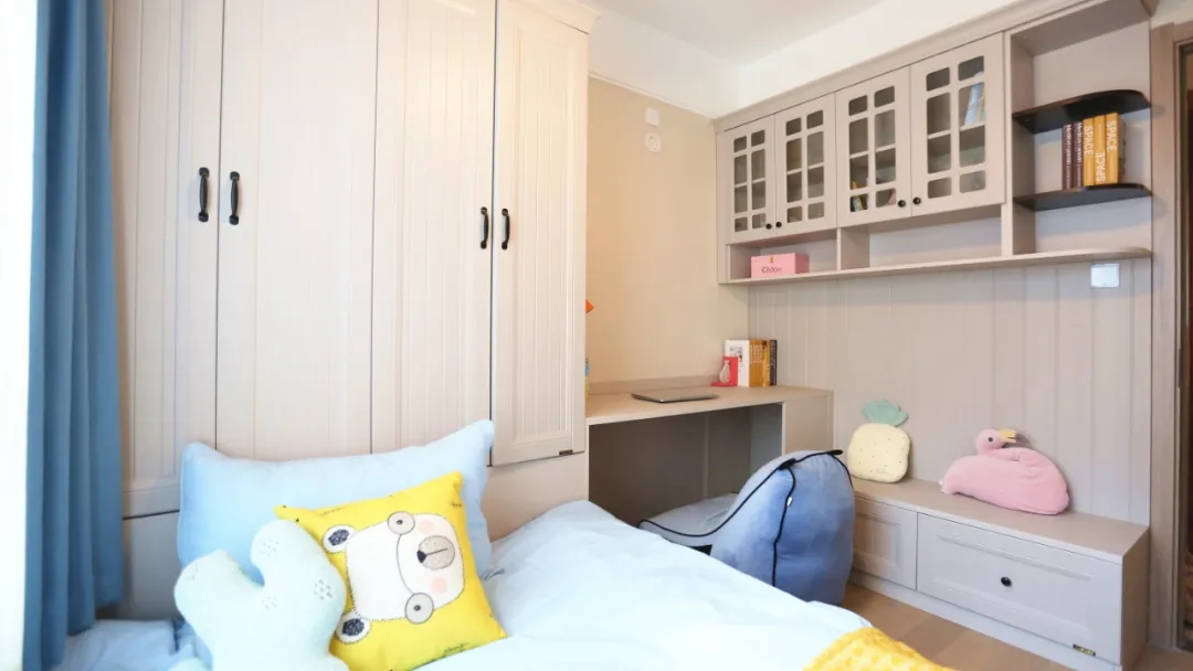 ? 定制榻榻米實(shí)現(xiàn)一屋多用。青少年房需涵蓋睡覺、儲(chǔ)物、學(xué)習(xí)的功能,因此設(shè)計(jì)師通過定制一體式榻榻米的方式,提高房間利用率,達(dá)到一屋多用的目的。咚咚的孩子快上小學(xué)了,審美也在不斷變化,房間無需做太過卡通的設(shè)計(jì),設(shè)計(jì)師通過簡(jiǎn)約的定制家具,搭配活潑的天藍(lán)色軟裝,打造適合孩子成長(zhǎng)的臥室空間。