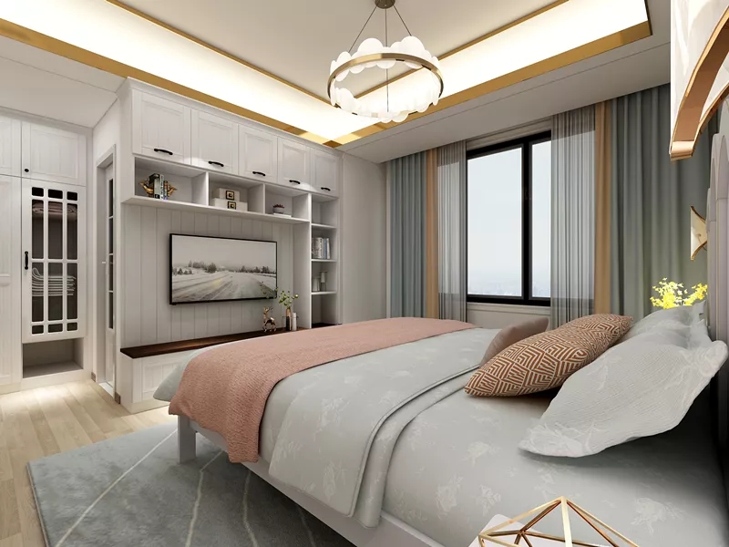 ? 主臥——定制電視柜收納臥室零碎。主臥是最私人的地方,一個(gè)舒適的大床必不可少。寬大床屏讓咚咚夫婦倚靠更舒適,床頭墻面的太陽造型裝飾品,也讓臥室多了一絲設(shè)計(jì)感。白天忙于工作,咚咚和丈夫只能在晚上睡前有片刻休閑時(shí)間,所以特別要求設(shè)計(jì)師在臥室留出視聽區(qū)域。因此,設(shè)計(jì)師利用衛(wèi)生間和睡眠區(qū)中間的隔斷墻定制嵌入式電視柜,在不占據(jù)臥室活動(dòng)區(qū)域的前提下,滿足了咚咚想在臥室看電視的心愿。同時(shí)定制電視柜的強(qiáng)大收納能力,也能為臥室增加收納空間,減少整理打掃的負(fù)擔(dān)。