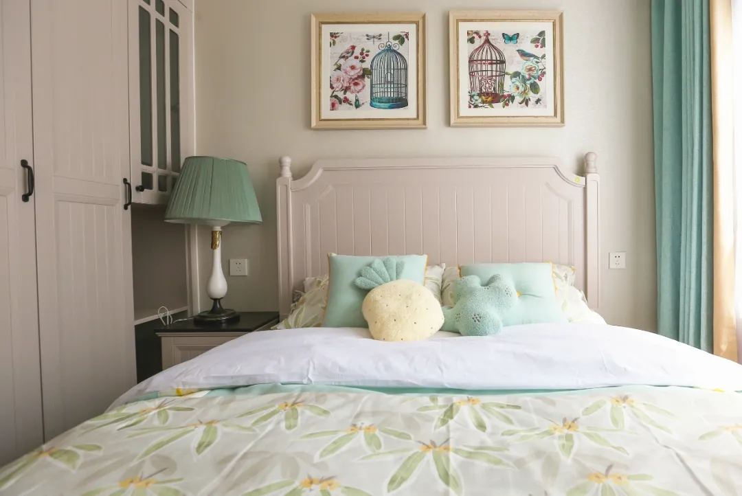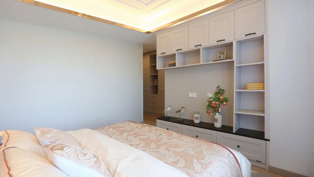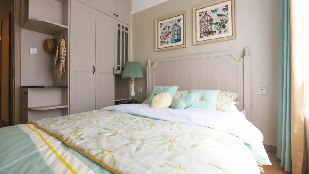 ? 同系列的定制衣柜和床奠定了老人房的基本格調(diào),清爽的水藍(lán)色軟裝豐富了臥室的層次感,木質(zhì)家具和布藝床品、精致燈具、掛畫,符合老人的審美。