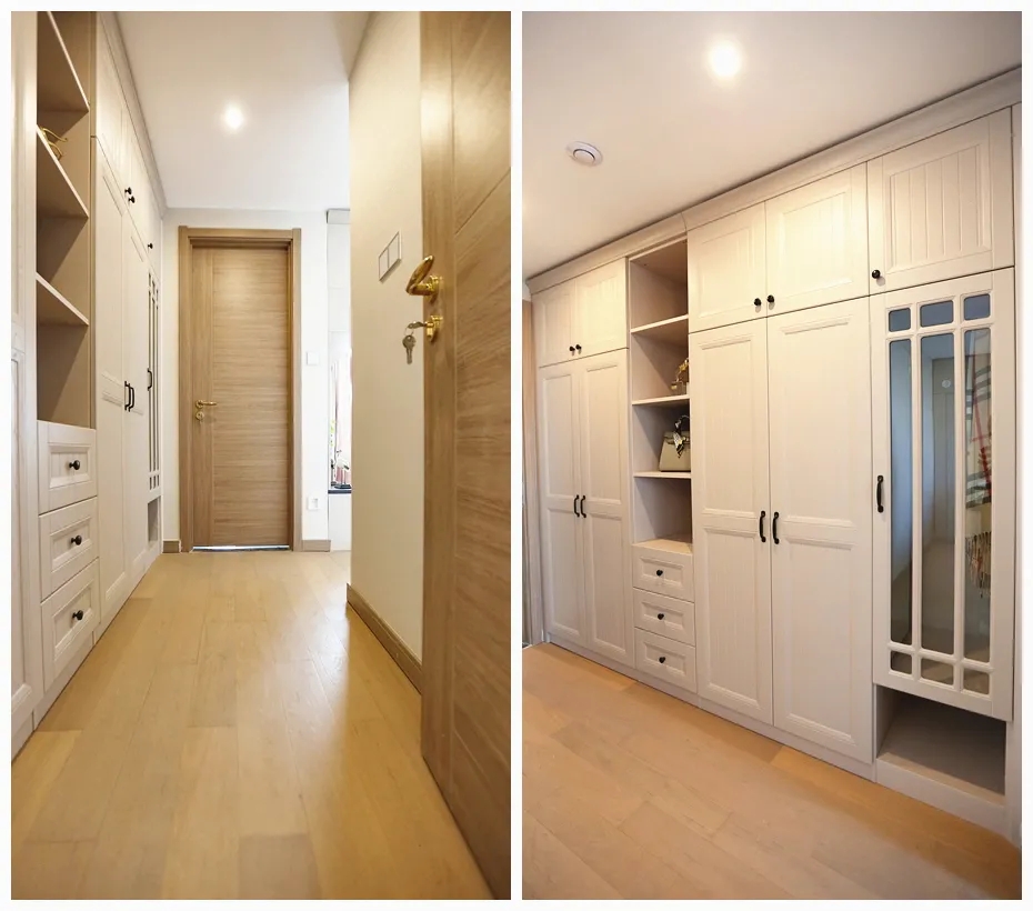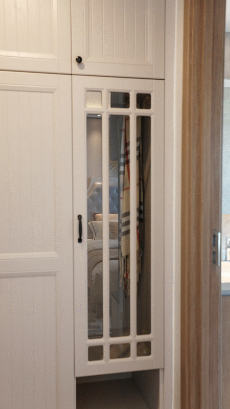? 臥室走廊——打造步入式衣帽間。進(jìn)入主臥,有一個(gè)走廊型區(qū)域,設(shè)計(jì)師將這里打造成步入式衣帽間,連通主臥洗漱區(qū)和睡眠區(qū),符合動(dòng)線。半開放式定制衣柜,合理分區(qū),不僅有長(zhǎng)短衣掛放區(qū),還有開放式收納格,可以有序分類放置衣物或包包。玻璃柜門內(nèi)隱藏旋轉(zhuǎn)穿衣鏡,節(jié)省臥室空間,使用時(shí)輕輕拉出即可對(duì)鏡整理衣著。
