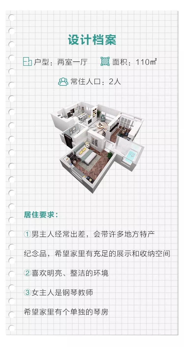 ??男主人經(jīng)常出差,會帶許多地方特產(chǎn)紀(jì)念品,希望家里有充足的展示和收納空間。女主人是個鋼琴教師,希望家里有個單獨的琴房。他們二人喜歡明亮、整潔的環(huán)境。