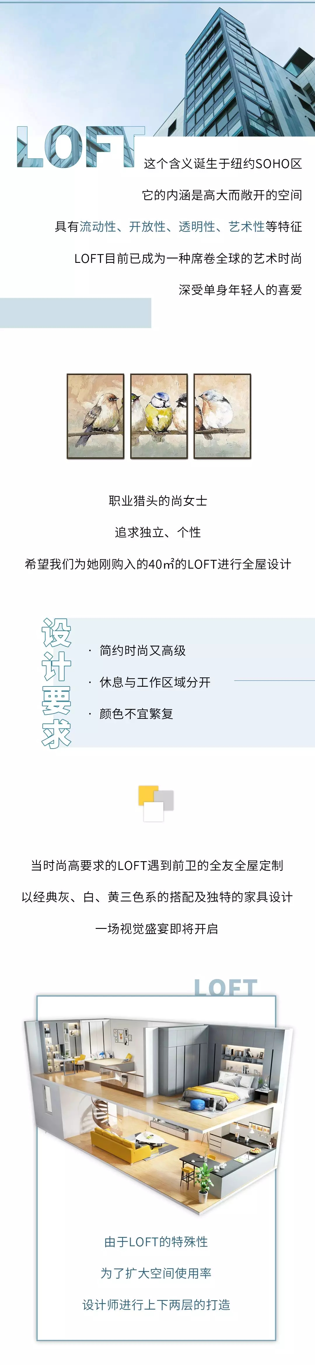 ??LOFT,這個(gè)含義誕生于紐約SOHO區(qū)。它的內(nèi)涵是高大而敞開的空間,具有流動(dòng)性、開放性、透明性、藝術(shù)性等特征。LOFT目前已成為一種席卷全球的藝術(shù)時(shí)尚,深受單身年輕人的喜愛。本案例中,業(yè)主是職業(yè)獵頭的尚女士,追求獨(dú)立、個(gè)性,希望我們?yōu)樗徣氲?0㎡的LOFT進(jìn)行全屋設(shè)計(jì)。