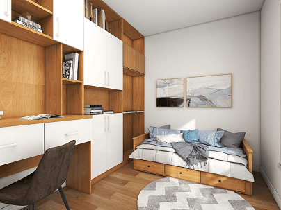? 書房:一整面向陽(yáng)擺放的到頂書柜,一張沙發(fā)床,滿足業(yè)主日常讀書的愜意時(shí)光,必要時(shí)也可以作為客房。