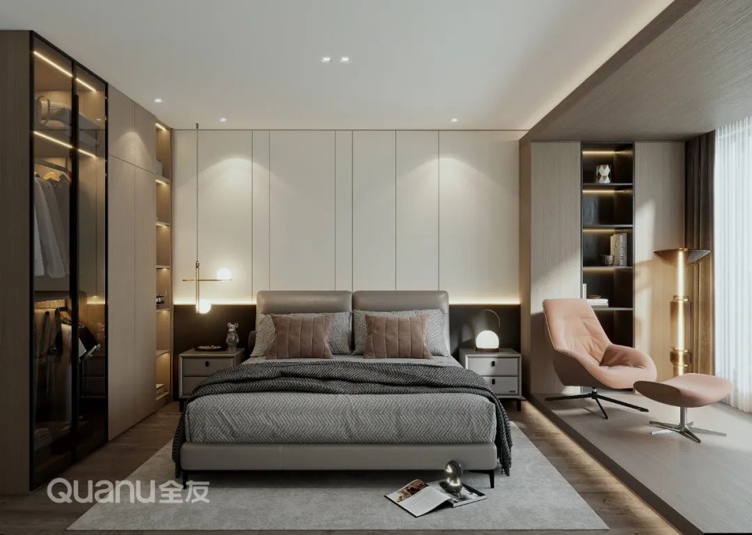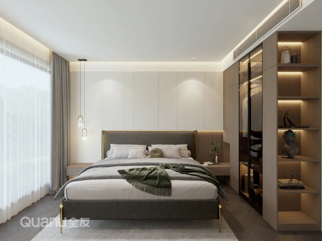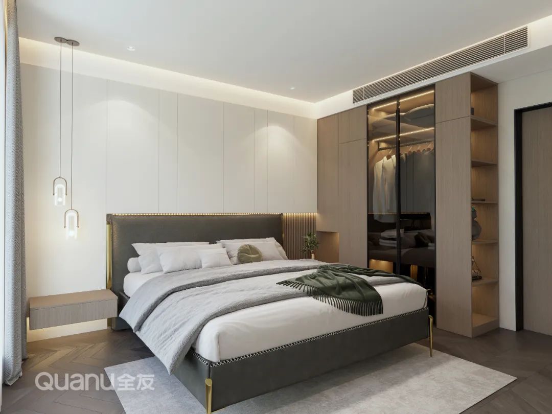 床頭精準(zhǔn)內(nèi)嵌,形成有序的美學(xué)節(jié)奏,衣柜留出開放格,延展出臺面充當(dāng)床頭柜,懸空設(shè)計輕巧靈動,整體性更強(qiáng)。