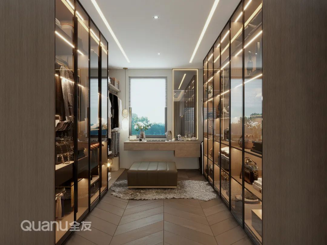 燈帶光影透過兩側(cè)玻璃柜門進(jìn)行點綴,精致感洋溢衣帽間,彰顯空間格調(diào)。同時增添光線,方便裴女士挑選衣物,靠窗處定制懸空臺面,換衣梳妝一氣呵成。