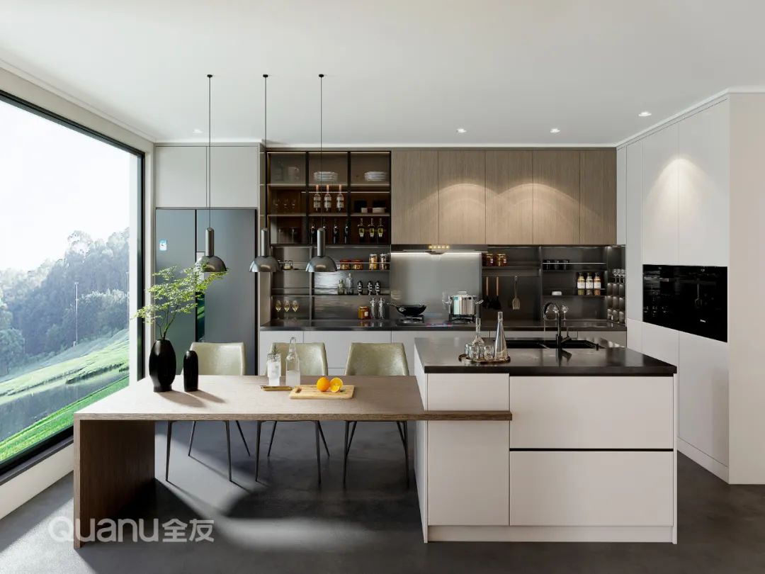 島臺+餐桌一體,充分利用空間;開放式設(shè)計,增加社交屬性,更方便親人之間的互動交流。