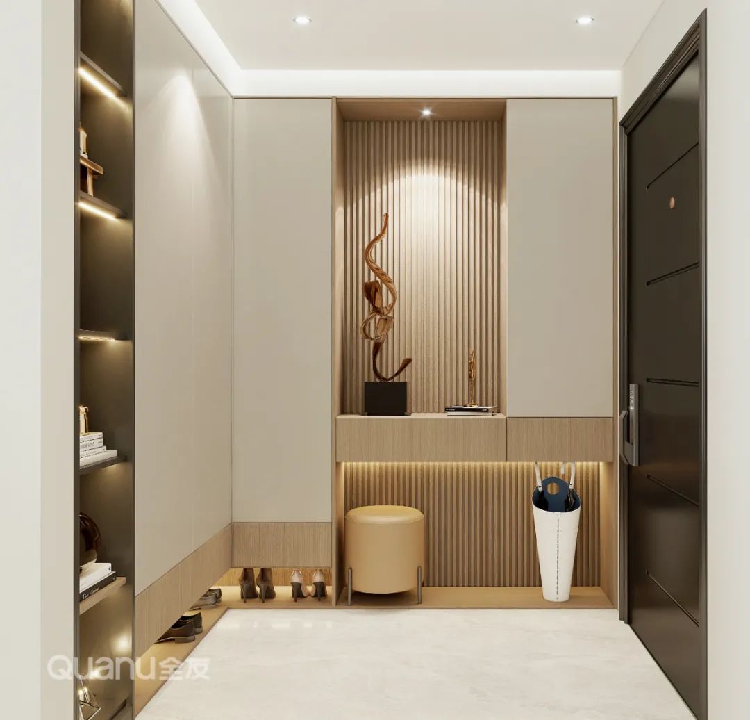 入戶定制L型玄關(guān)柜,柵格板搭配藝術(shù)擺件,儲物與顏值兼?zhèn)?。感?yīng)燈、換鞋凳、雨傘收納筒細(xì)節(jié)滿滿,讓出入更從容。