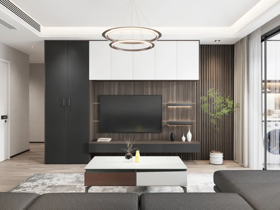 為滿足客廳儲物需求,電視墻做了U型電視柜,通體柜門+吊柜+懸空地柜組合,黑白相宜,渲染出深暗交錯(cuò)的層次感,同時(shí)拉伸視覺,延展空間高度。再以柵格背板做裝飾,與柜體結(jié)合,賦予空間靈動的美感。