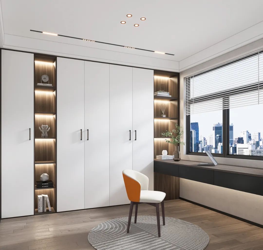 在窗戶下設(shè)置懸空臺面作為書桌,連通書柜,桌柜一體,動線流暢,資料拿放方便順手。靠窗打造,采光優(yōu)越,工作效率更高,袁先生工作疲憊時(shí)可以向窗外遠(yuǎn)眺,放松身心。