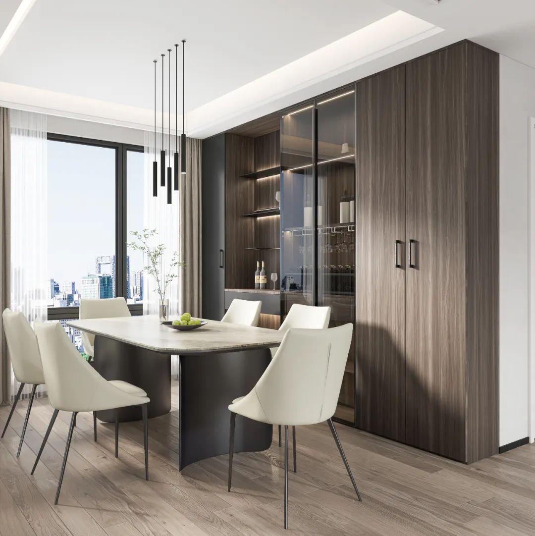 袁先生有收藏美酒和一些國外飲料的愛好,設(shè)計(jì)師便在餐廳定制了整墻餐邊柜。銀鉑灰+深色木材紋理帶來別致的高級感,再與頗具設(shè)計(jì)感的意式餐桌椅、吊燈搭配,營造出精致的就餐氛圍。為展示珍藏的飲品,在此設(shè)計(jì)師預(yù)留了部分玻璃柜門,通透明亮,內(nèi)置燈帶,視覺效果更加靈動,袁先生珍藏的各類酒水都能悉數(shù)放入。