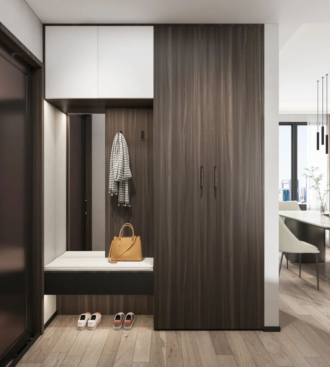 左側(cè)內(nèi)嵌玄關(guān)柜,深淺配色雅致交融,一門到頂,整體性強(qiáng)。