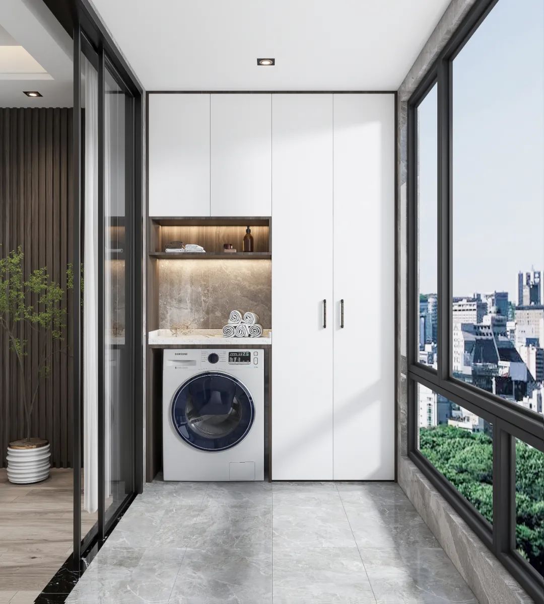 陽臺定制生活組合柜,超高門板沒有視覺斷層,大氣統(tǒng)一,打造洗衣臺,放置洗衣機(jī),洗衣晾衣一步到位。