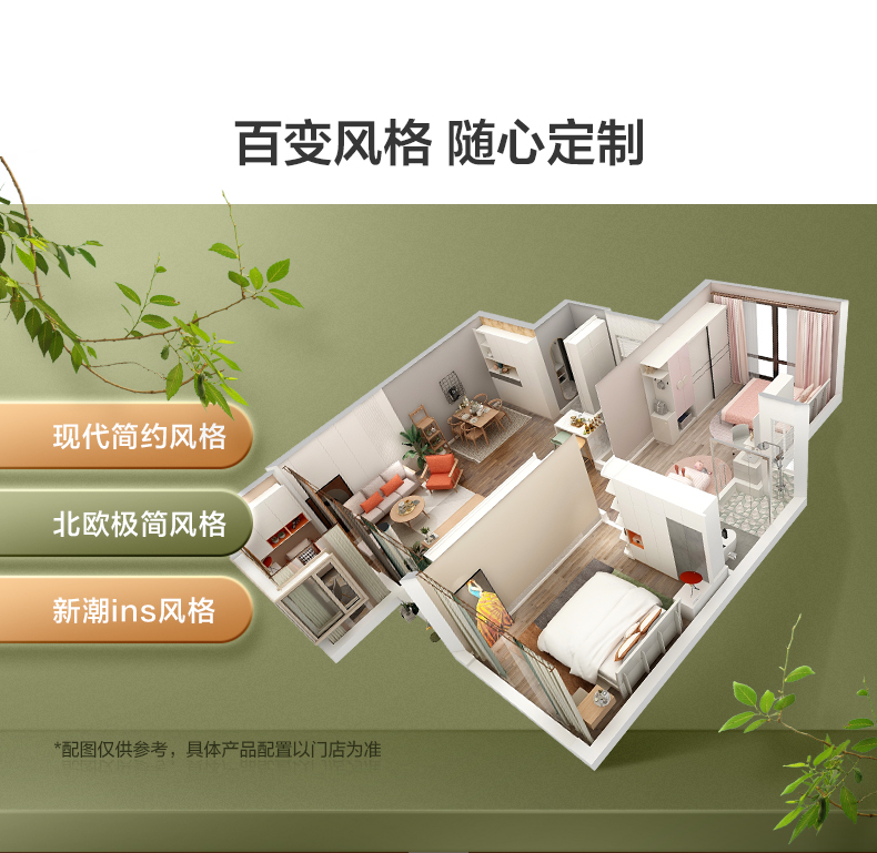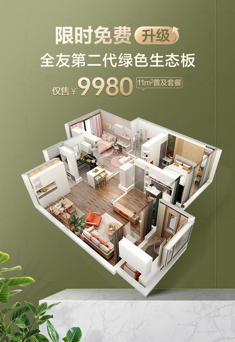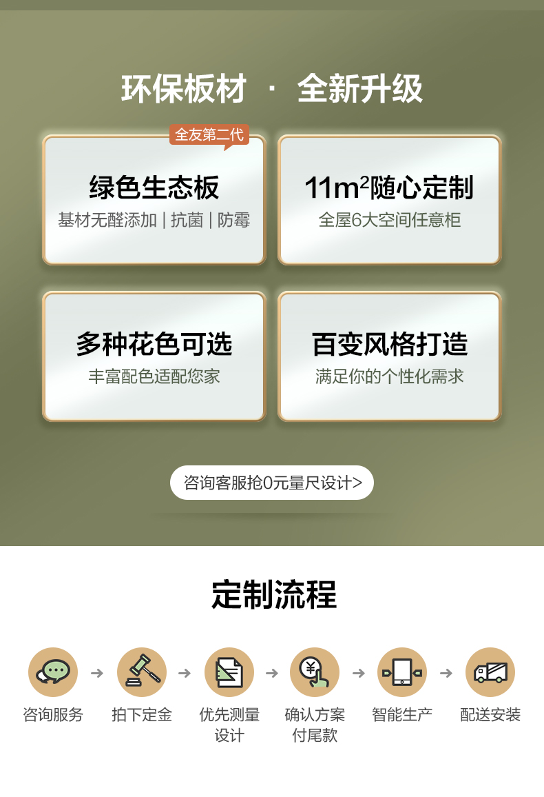 全友(QUANU)定制家具,9980元定制11㎡綠色生態(tài)板家具,入戶玄關、鞋柜、餐邊柜、酒柜、衣柜、衣帽間、書柜、陽臺等,組合客廳書房一體設計。