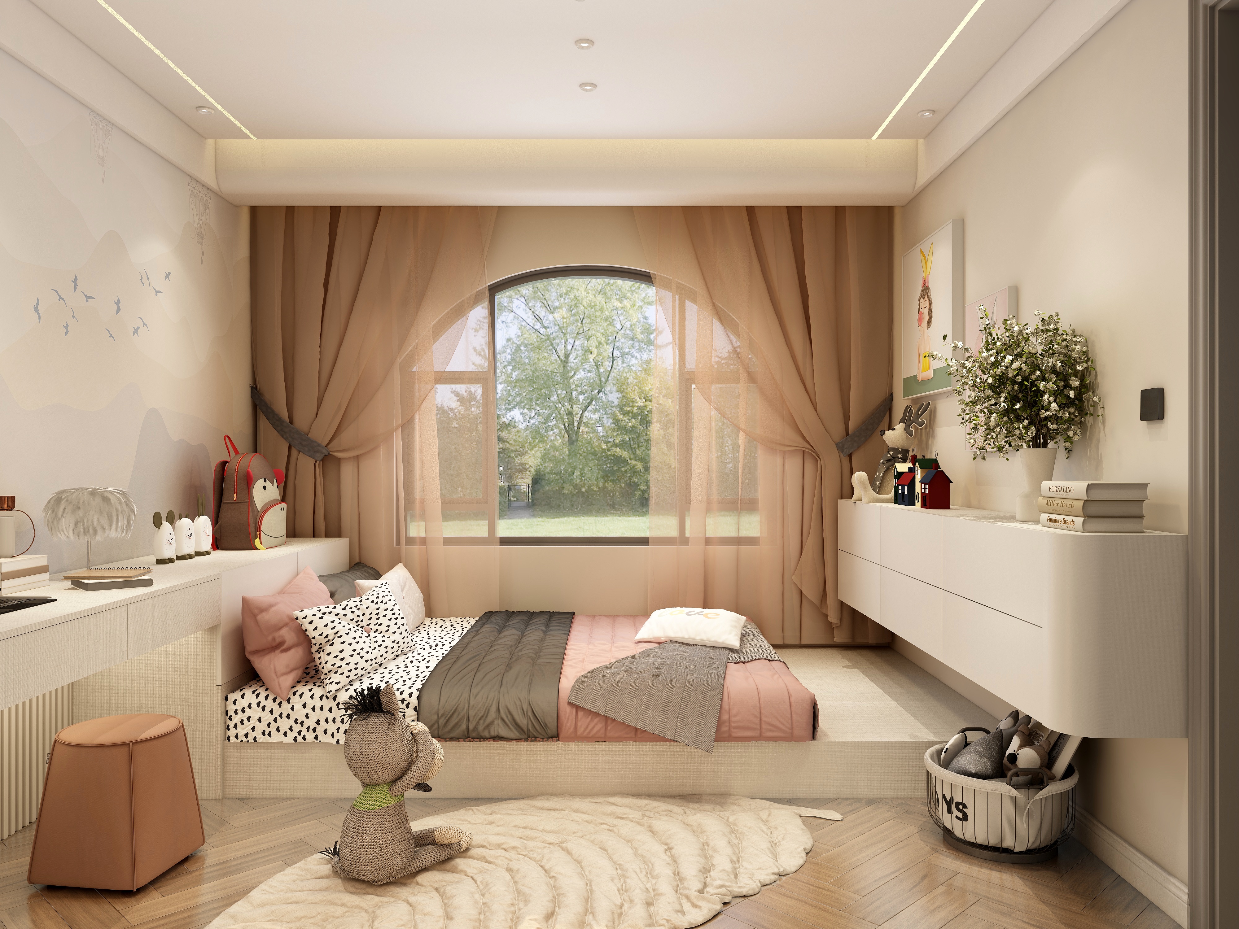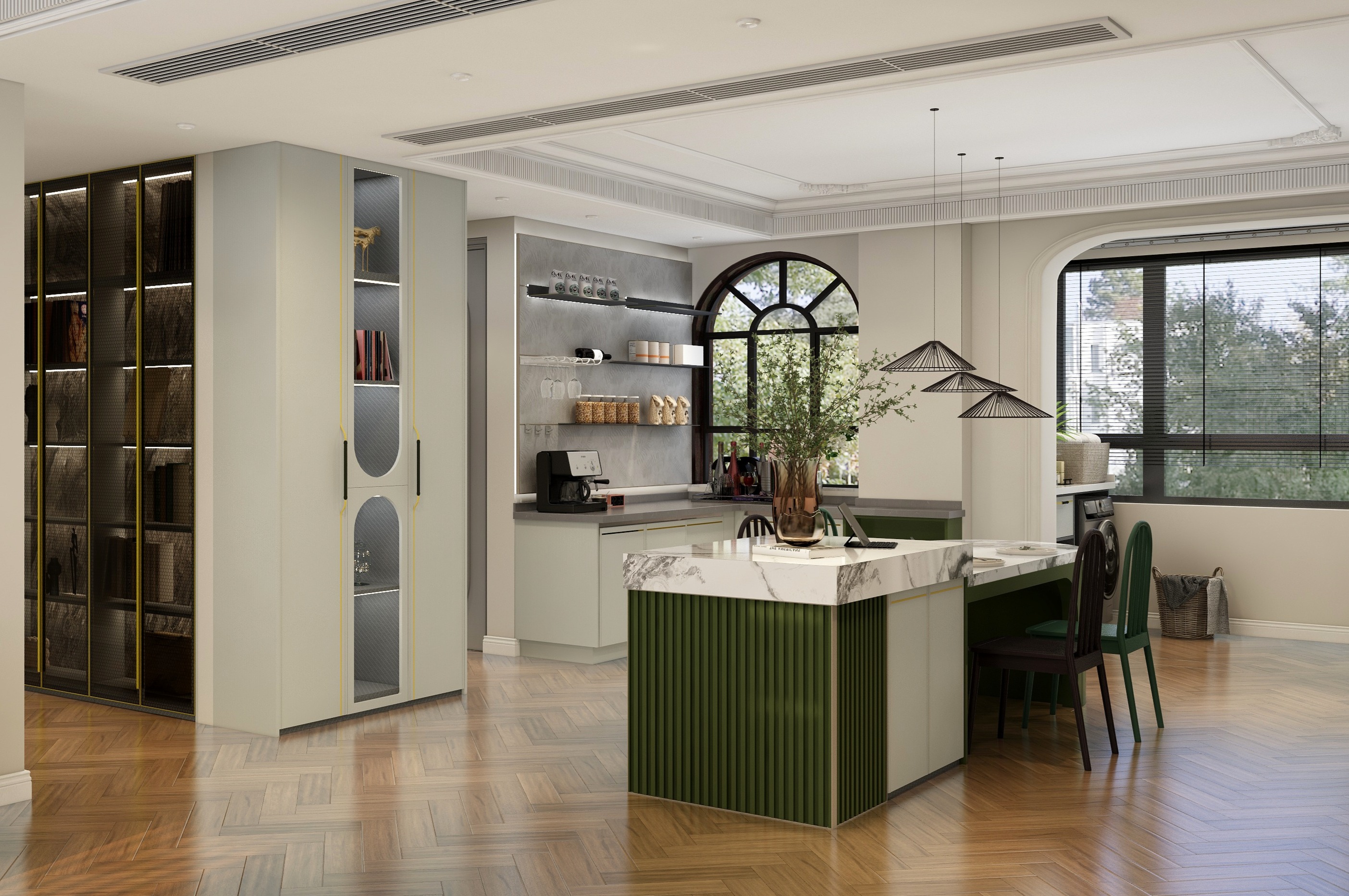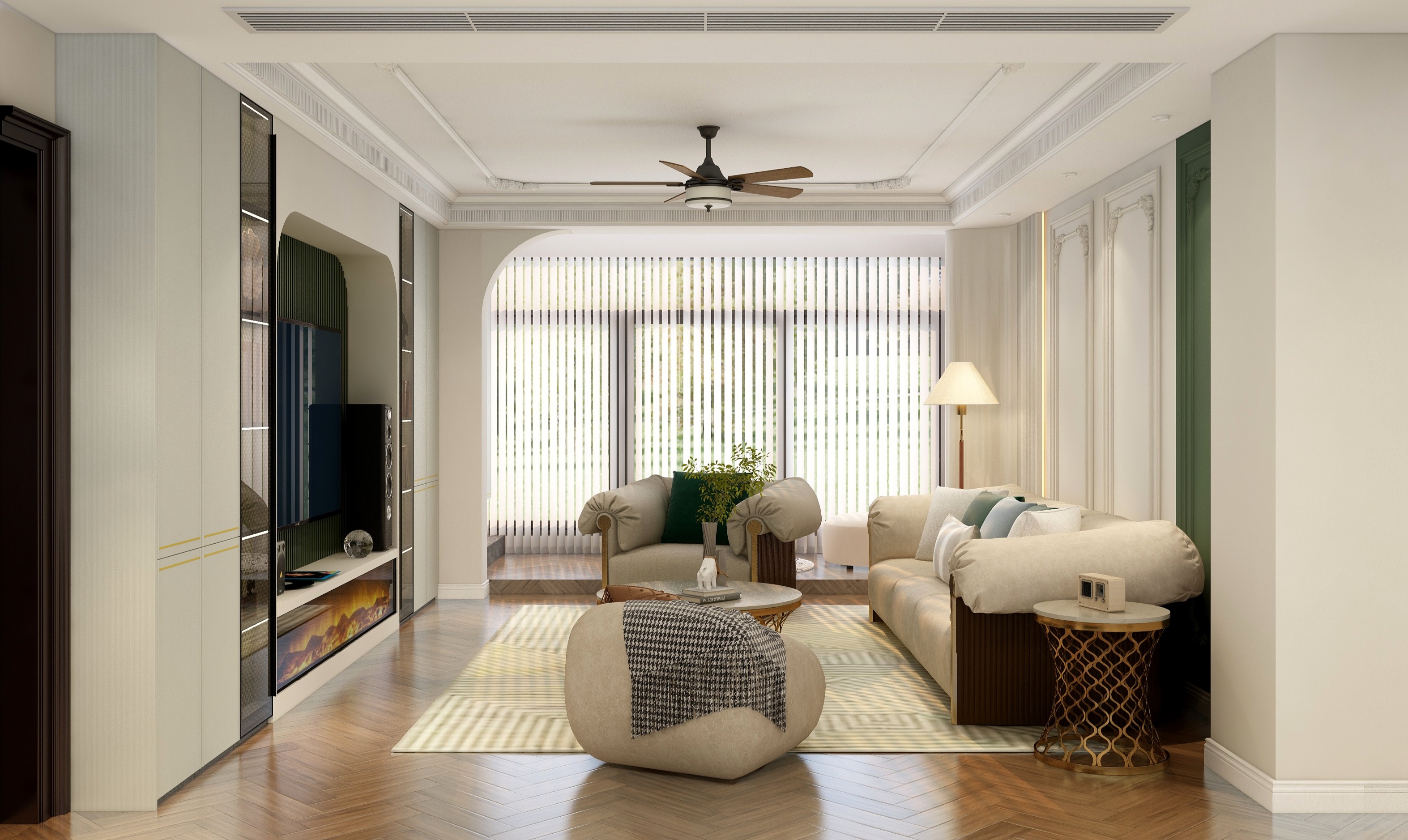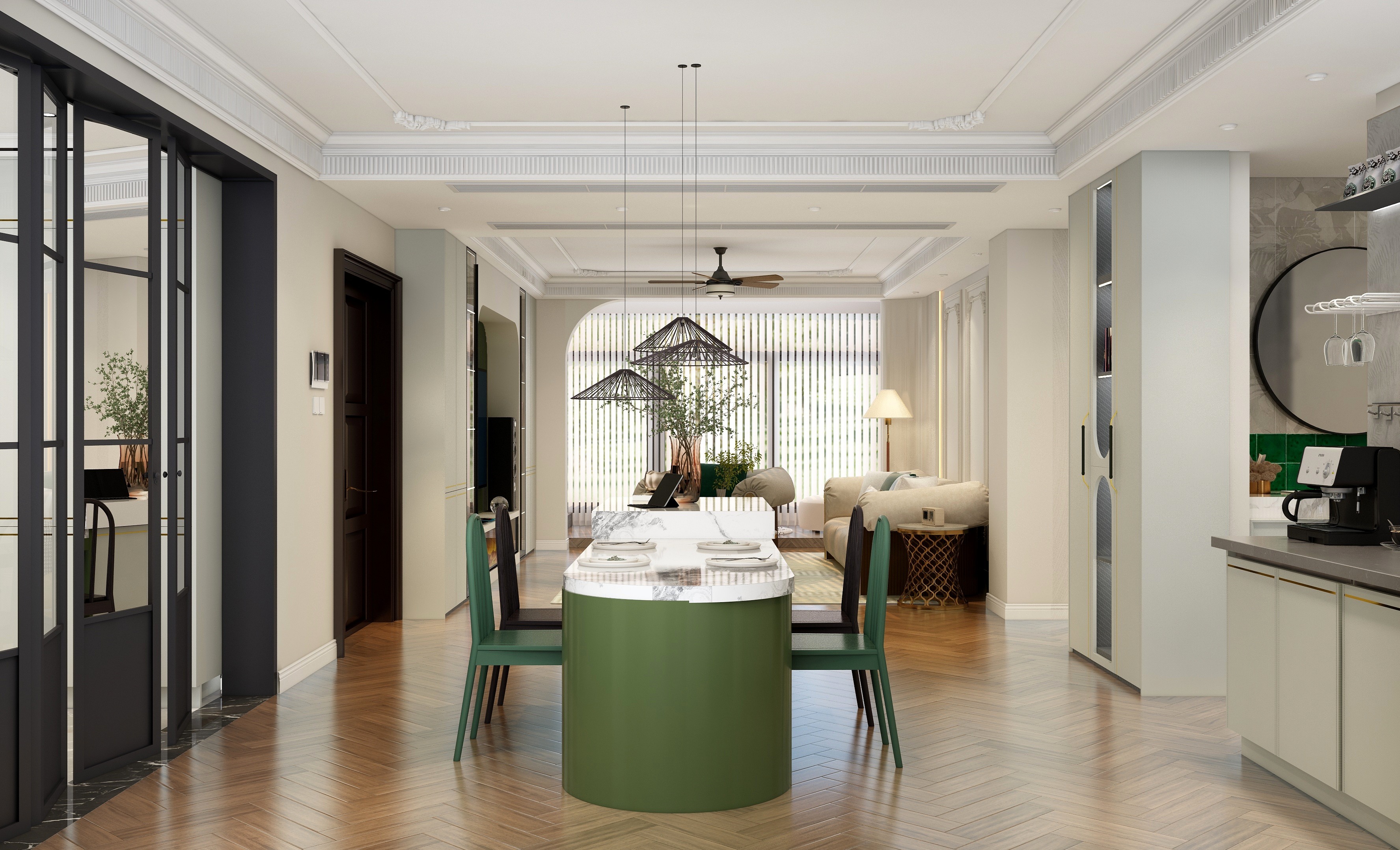 整體方案圍繞”個性“”復(fù)古“”生活化“三個關(guān)鍵詞進行設(shè)計,通過圓弧線條,加???然元素,將?然融??活,打造浪漫復(fù)古風(fēng)情。將整個空間合理利用,陽臺改成地臺,視角上擴大空間感,采用拱形門口隔斷,柔化空間線條,屋主的品味盡顯無疑。