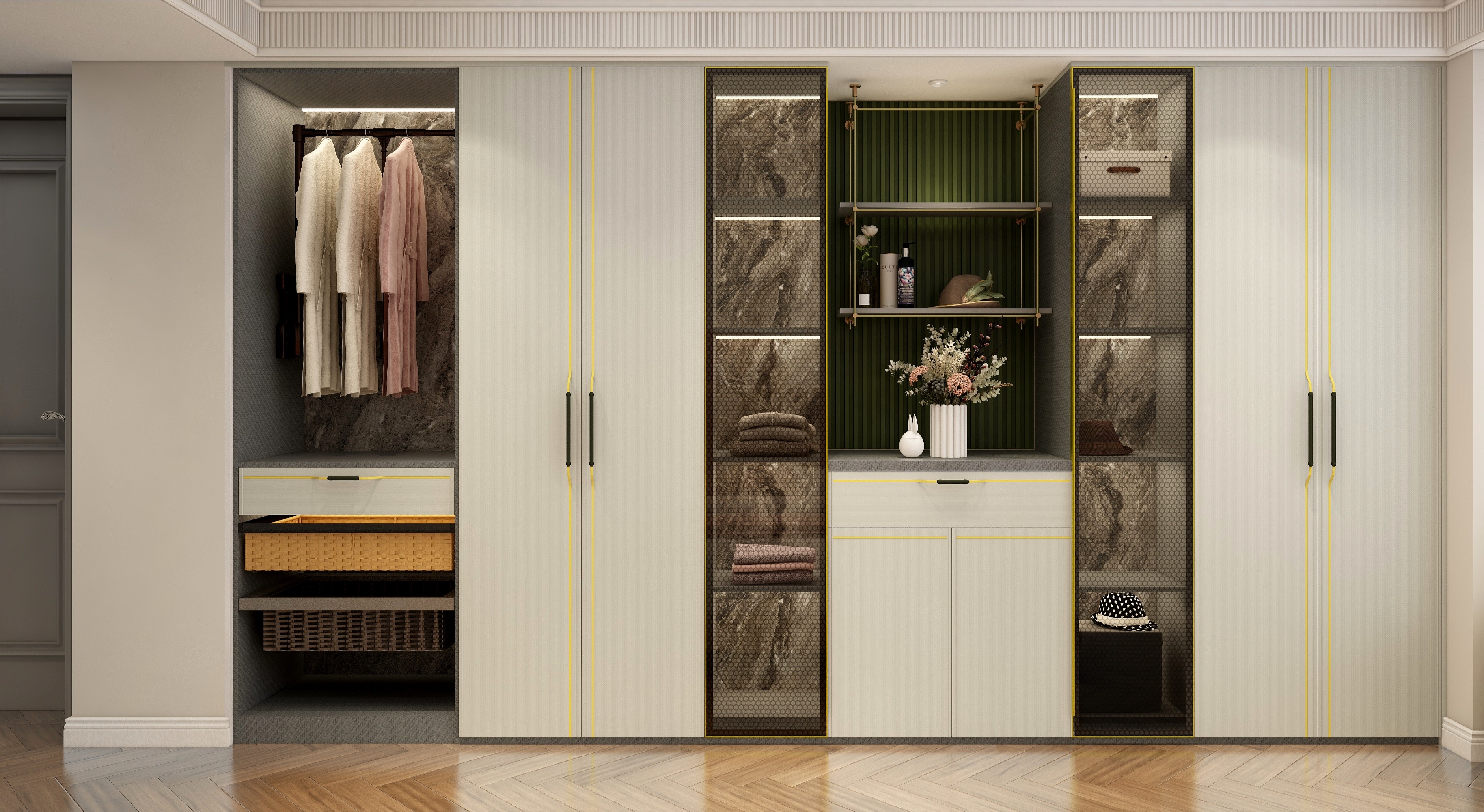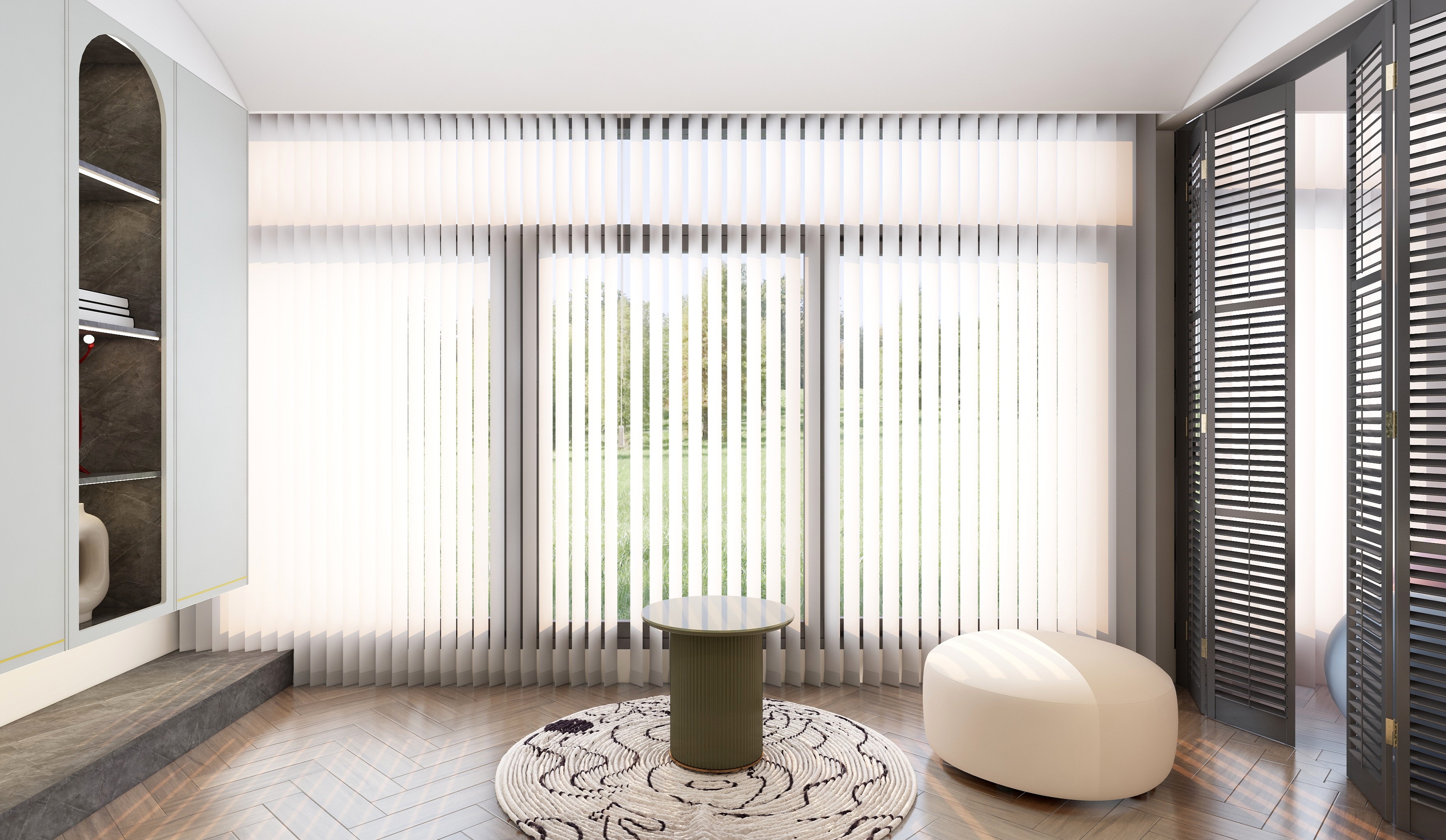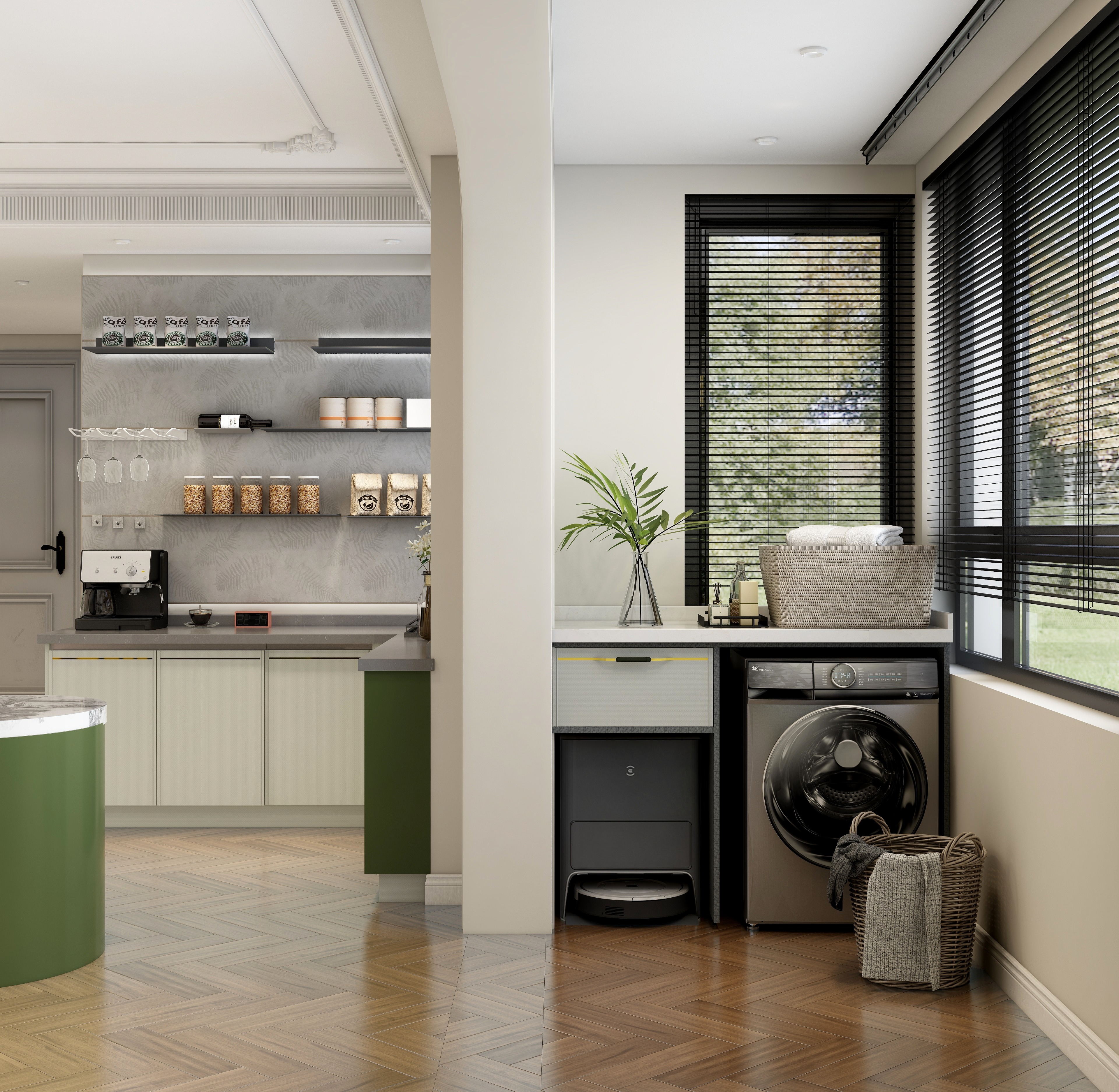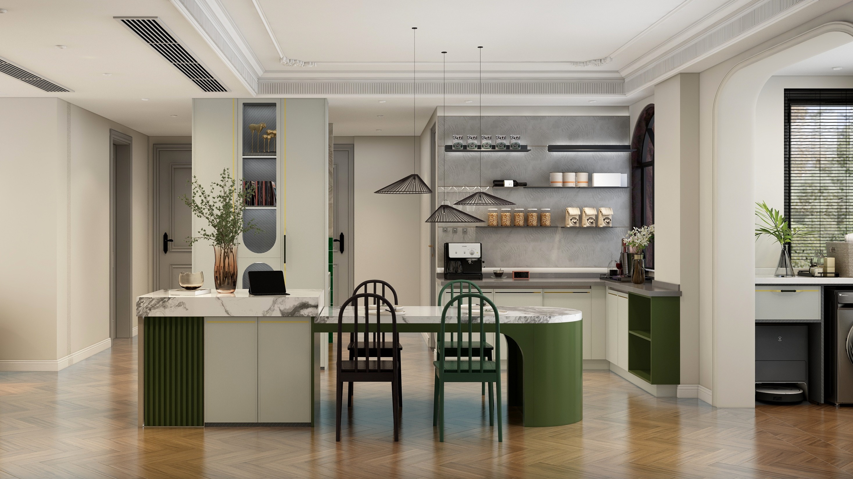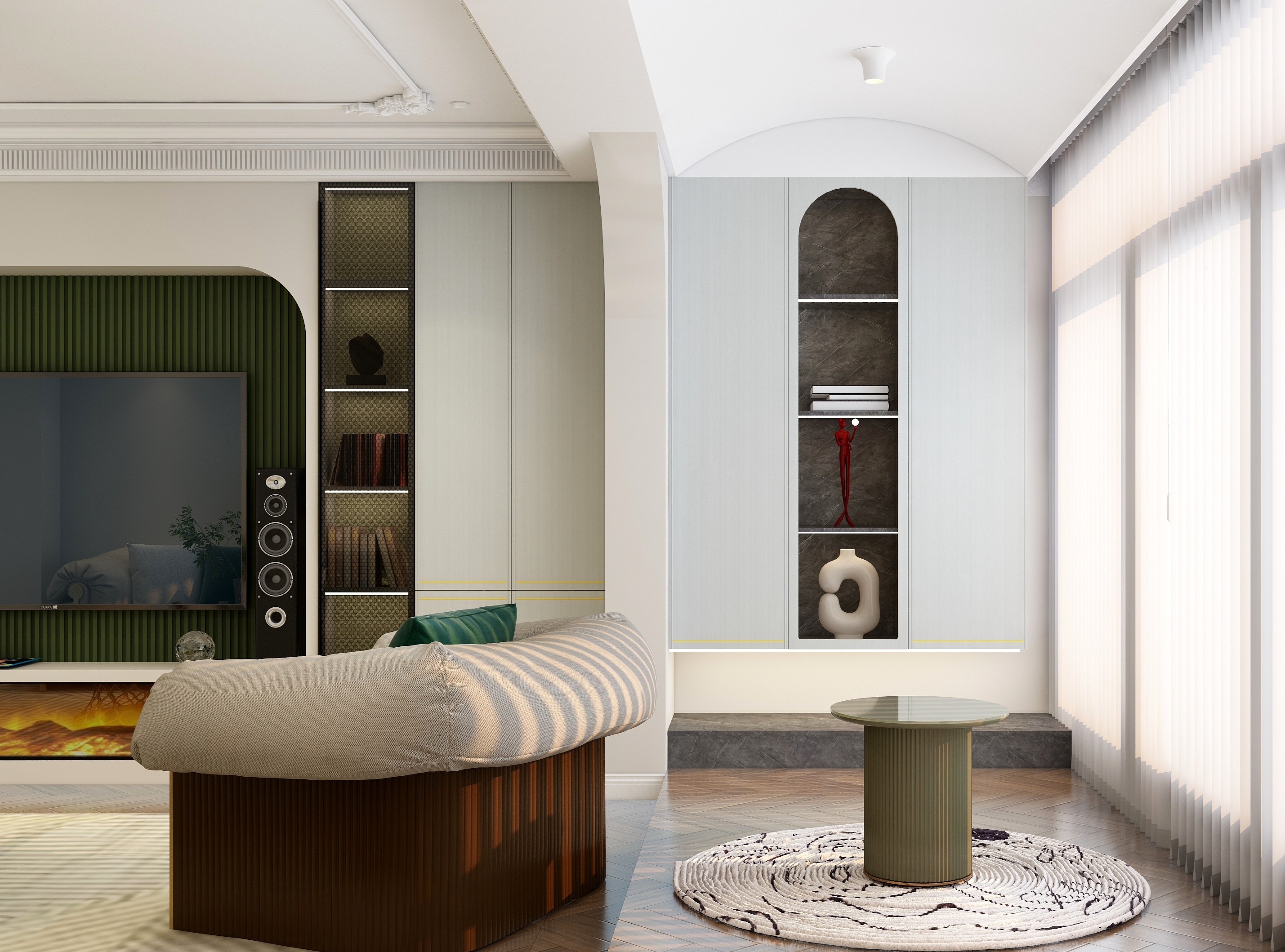整體方案圍繞”個性“”復(fù)古“”生活化“三個關(guān)鍵詞進行設(shè)計,通過圓弧線條,加???然元素,將?然融??活,打造浪漫復(fù)古風(fēng)情。將整個空間合理利用,陽臺改成地臺,視角上擴大空間感,采用拱形門口隔斷,柔化空間線條,屋主的品味盡顯無疑。
