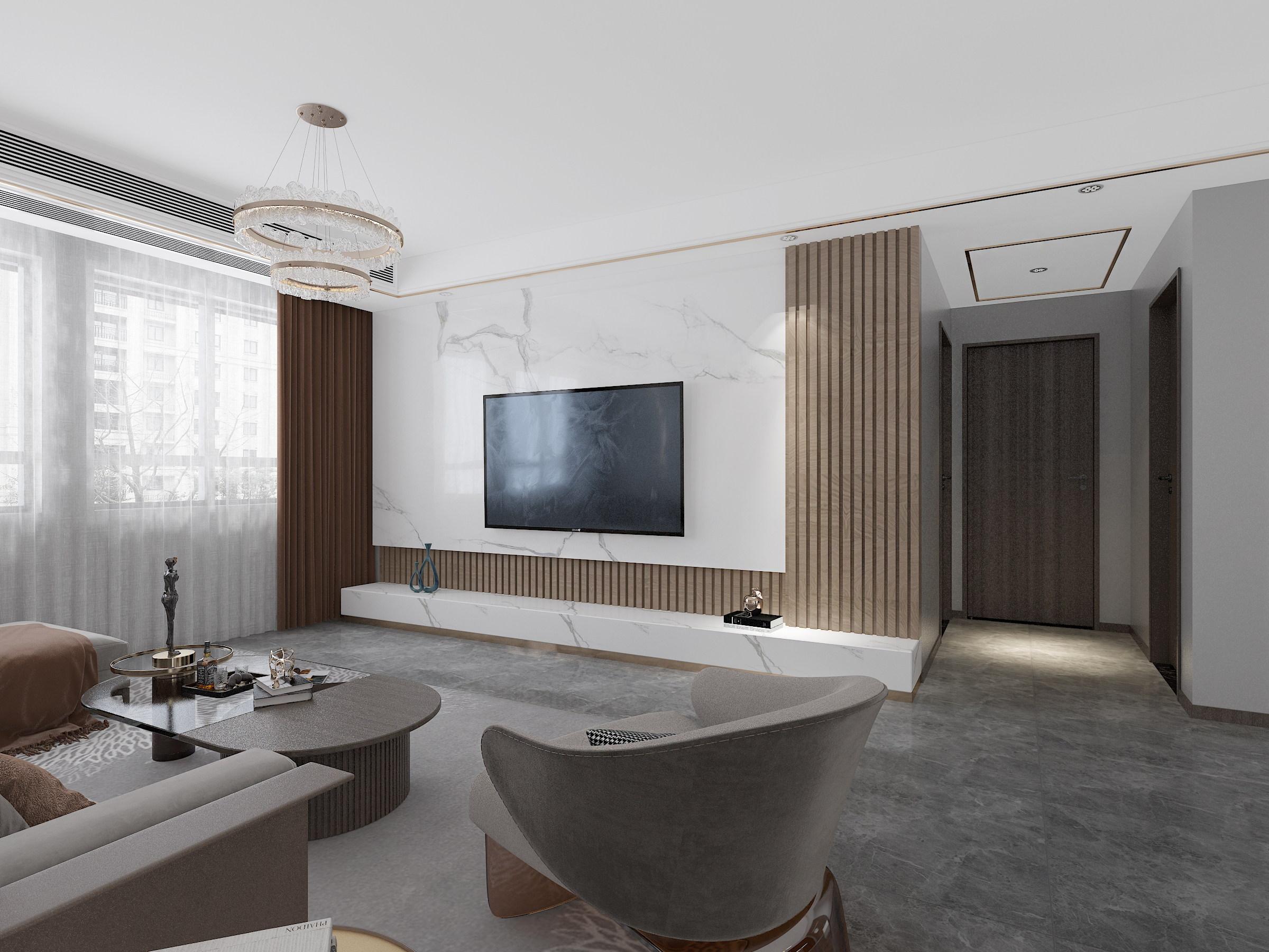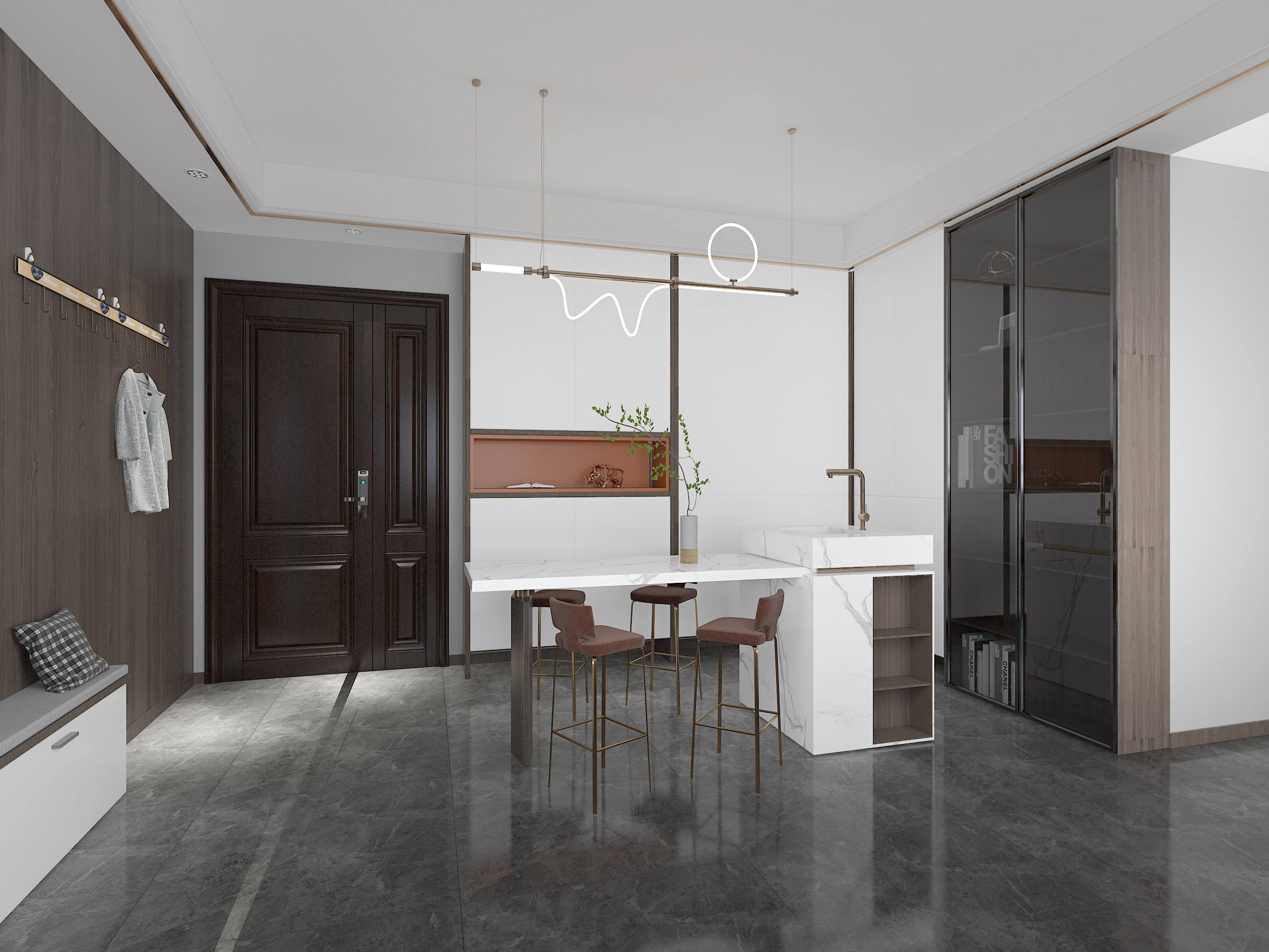 ? 客戶比較年輕,喜歡亮堂、大氣的感覺,在第一次溝通的時候就喜歡造型,喜歡金屬條,喜歡巖板、墻板,一定要裝的比較豪華。金屬線條和木紋墻板的搭配,確實比較舒服,營造的氛圍也比較溫馨,而且很大氣。