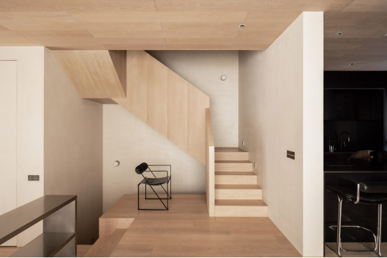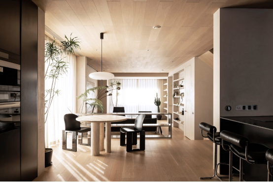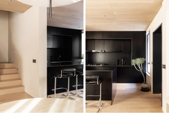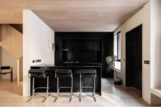 去掉天井之后的一層,主要被劃分成兩大活動(dòng)區(qū)域,右側(cè)是以會(huì)客為主的客廳兼帶客衛(wèi),左側(cè)則是開放式餐廚空間??臻g的劃分變得更加明確,不僅是采光得到了極大的提升,空間感也更強(qiáng)。米色調(diào)墻面結(jié)合木色、黑色、不銹鋼色貫穿全案,讓整個(gè)設(shè)計(jì)擁有了整體性,但這些色彩又以不同的比例在各個(gè)空間中呈現(xiàn),使得所到之處都充滿驚喜