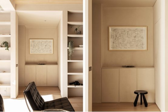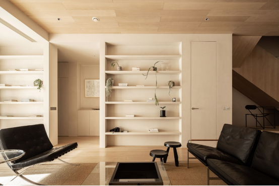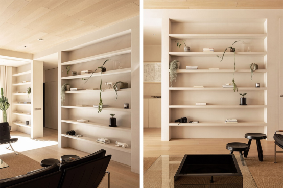 從玄關(guān)進(jìn)入客廳,首先能看見兩面相互對(duì)稱的內(nèi)嵌式書墻,這里用來陳列書籍、植物和男主人收藏的擺件。為了防止變形,隔板內(nèi)使用了方鋼,十分穩(wěn)固。內(nèi)嵌的燈帶,也可以在夜晚提供照明,讓周圍充滿氛圍感。書墻表面依舊刷了米色涂料,讓它與墻面材質(zhì)色彩一致,也和周圍的木色十分搭調(diào)。書架的高度和左側(cè)的梁、右側(cè)的門洞同高,也是為了更有整體性。