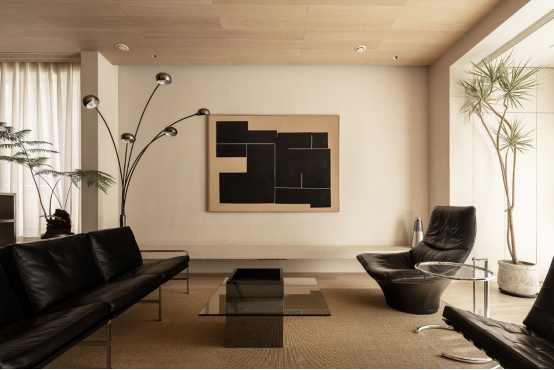 來到客廳中心,可以看出全屋追求極簡,但不乏豐富的視覺層次,硬裝上簡練的線條,給沙發(fā)區(qū)的布場留有足夠的發(fā)揮空間。設(shè)計(jì)之初考慮到男主人所傾向的風(fēng)格是寧靜、簡約和品質(zhì)感,所以在一片柔和的色系中,選擇了全套黑色的沙發(fā),盡可能減少跳脫的色彩,更好地放大造型和材質(zhì)的特質(zhì),讓細(xì)節(jié)更加經(jīng)得起推敲。