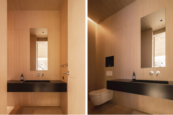 一層客衛(wèi)因?yàn)橹还┛蛷d使用,所以沒有設(shè)計(jì)淋浴區(qū)。無淋浴區(qū)的衛(wèi)生間大膽使用了木飾面,和客廳質(zhì)感統(tǒng)一的同時(shí),顯得更溫馨。黑色巖板洗手池頗具質(zhì)感,金屬色的鏡邊和水龍頭相呼應(yīng),細(xì)長的鏡子讓層高看起來更高。