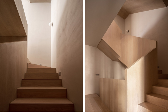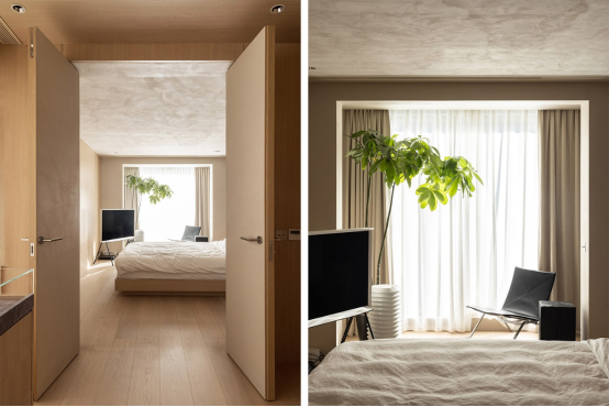 床榻的左手邊有一扇雙開的隱形門,門的表面刷了和墻面一致的色漆,更有整體性。而推開兩扇非常有儀式感的門之后,會(huì)進(jìn)入木盒子一樣的空間。原來的天井被填平之后,空間被納入主臥,所以這里就成為了男主人的衣帽間。L型的落地衣柜隱去了把手,和地面、天花板融為一體。旁邊的矮柜可以用來放領(lǐng)帶、手表、首飾等小物件。大面積淺木色不會(huì)顯得空間壓抑,給人無限溫柔的感受。