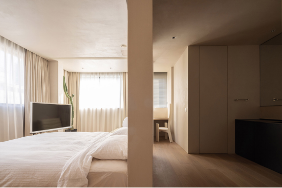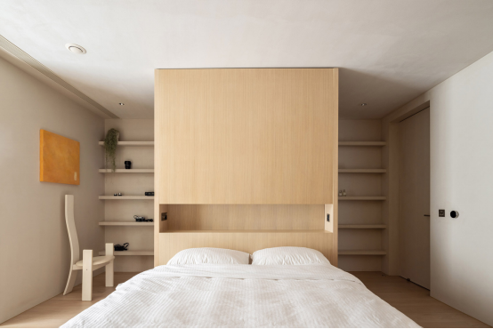 主臥的格局就比較有趣,臥室、三分離衛(wèi)生間、雙開門衣帽間分別形成了中軸對(duì)稱,很有秩序感。床在臥室的中心,因?yàn)楸趁嬖O(shè)計(jì)了通頂?shù)谋嘲?,所以整體形成了一個(gè)“洄游動(dòng)線”。從外面進(jìn)入室內(nèi),背板的遮擋,讓生活擁有一定的私密性。床頭兼具收納功能,在條狀壁龕的側(cè)壁設(shè)置了插座和開關(guān),方便屋主隨手充電和放東西。