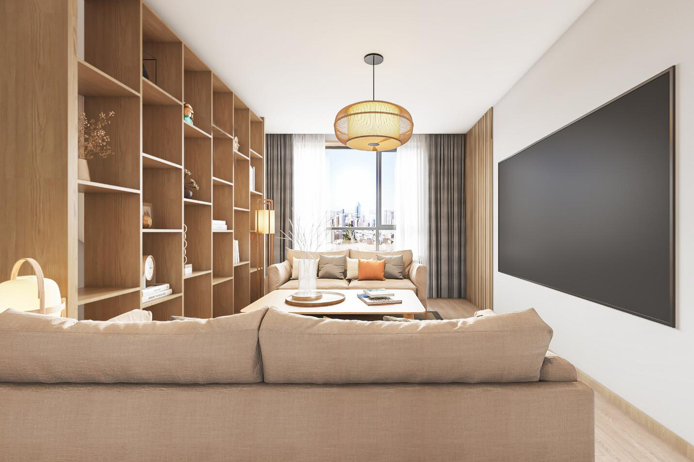 原木日式風(fēng),不做傳統(tǒng)客廳,定制的書柜增加收納!