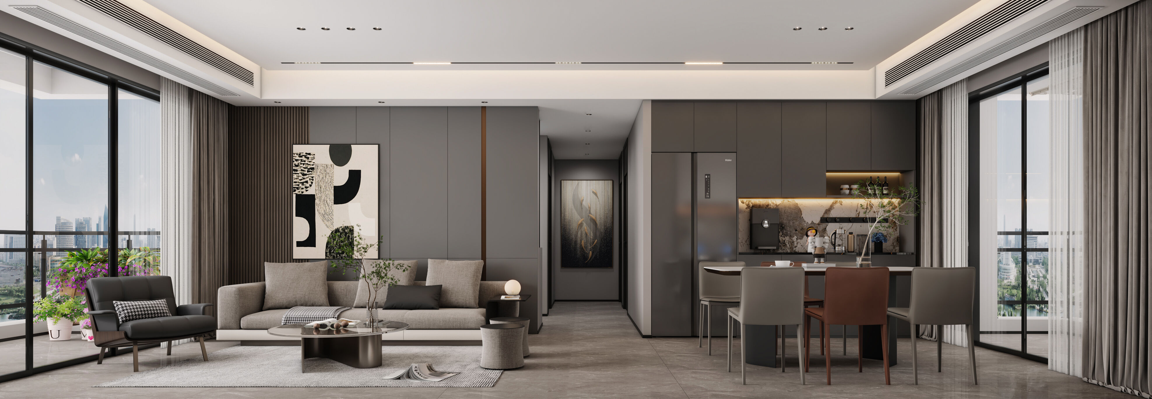 大橫廳布局+暗黑系配色,打造沉穩(wěn)大氣簡約宜居風