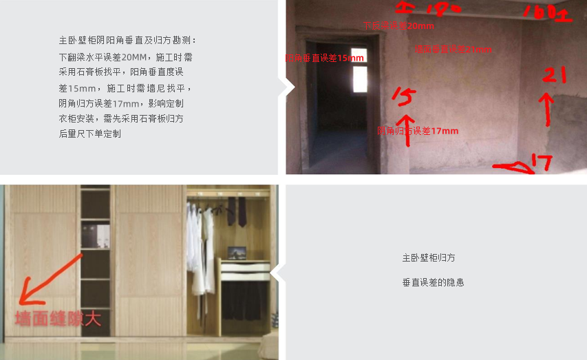 6、主臥衣柜歸方誤差17MM,陽角誤差15MM,