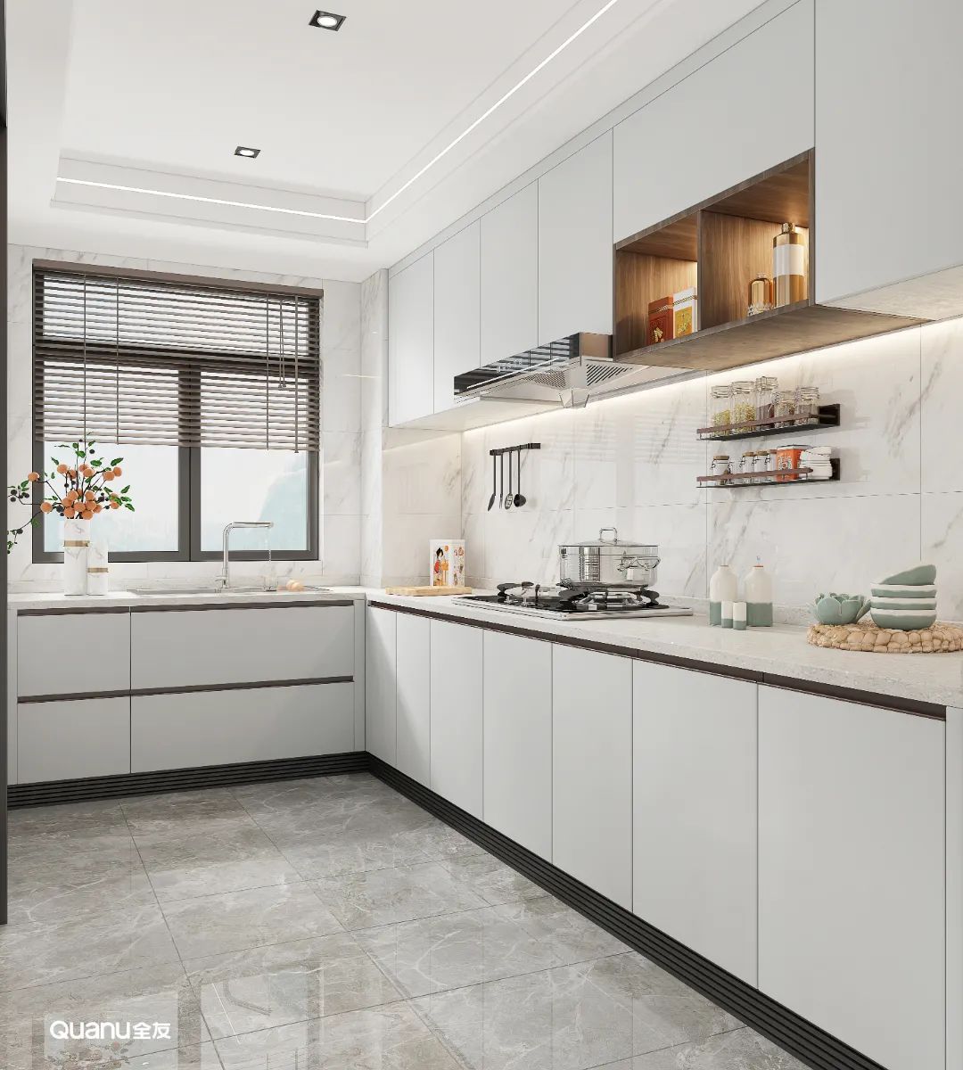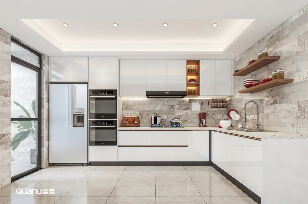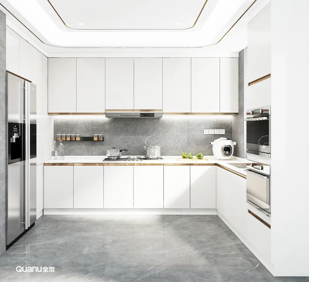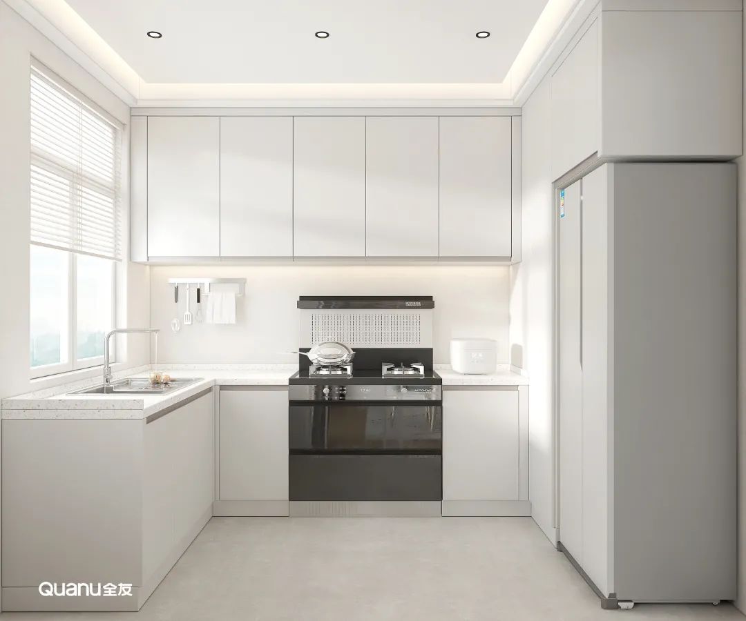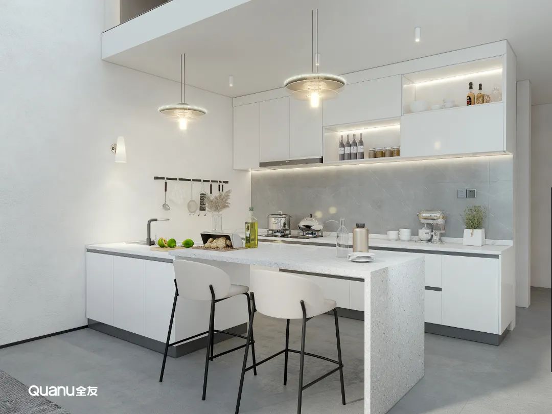 白色經(jīng)典百搭,是大部分廚房設(shè)計(jì)的第一選擇。白色的櫥柜簡約大氣,搭配流暢的線條,在視覺上有延伸空間的效果,讓整個(gè)廚房顯得更明亮、寬敞、潔凈。而且有一點(diǎn)污漬就能夠馬上看到,方便做完飯后及時(shí)清理,讓廚房每天都保持干凈整潔。