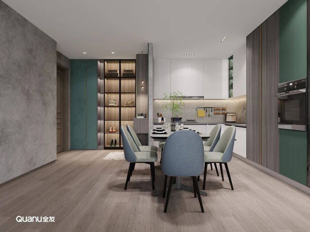 偏深一點(diǎn)的綠色可以帶來典雅的復(fù)古質(zhì)感,亦或是韻味十足的中式格調(diào),而同時(shí)又不會(huì)讓人感到壓抑,反而賦予了廚房獨(dú)特的高貴質(zhì)感,彰顯出主人高級的品位。