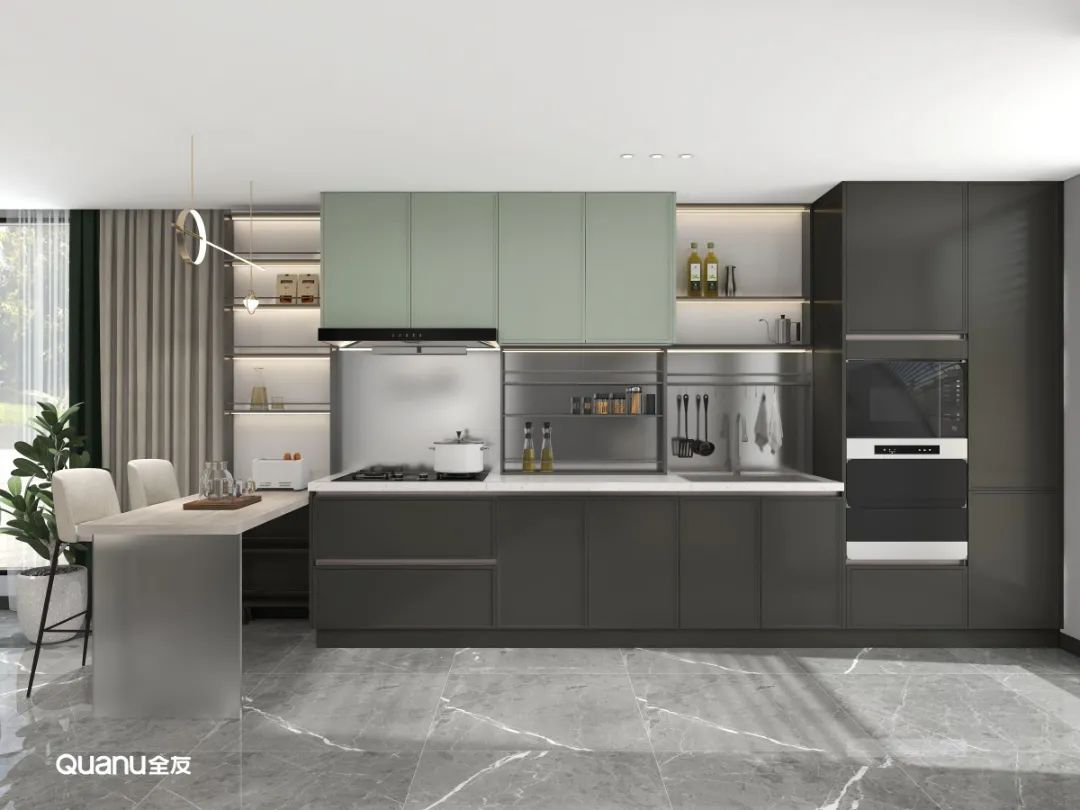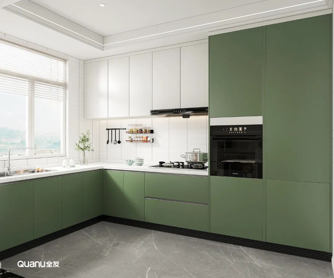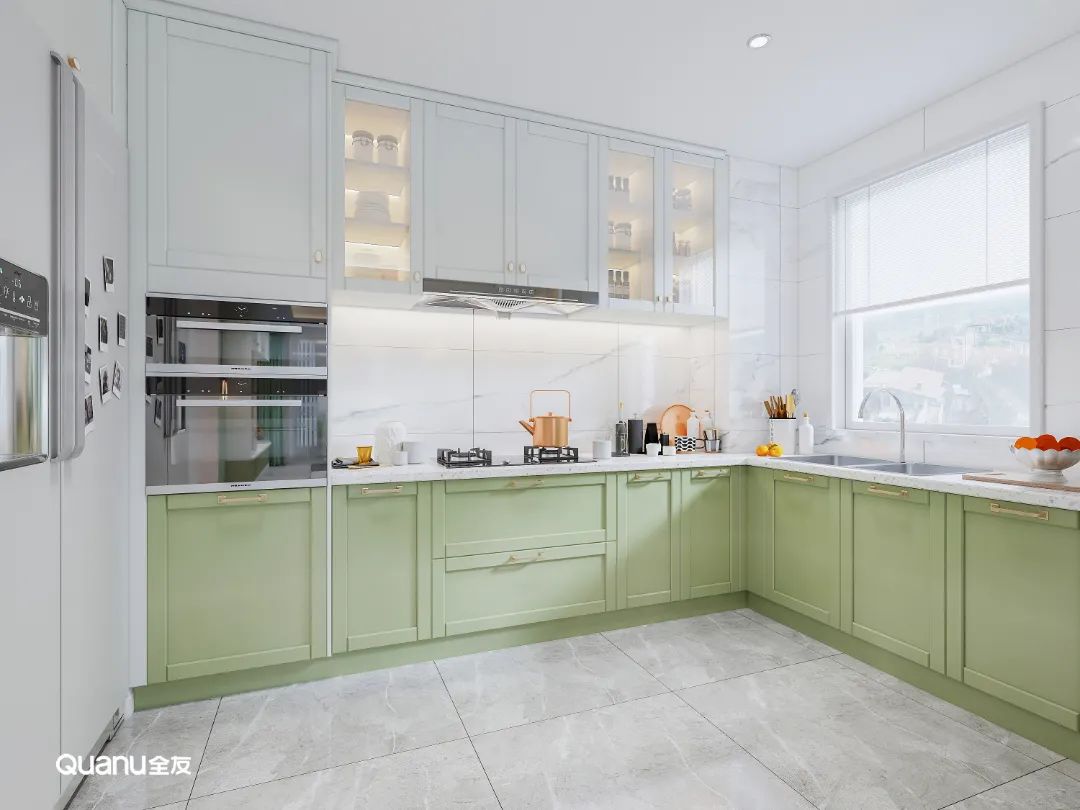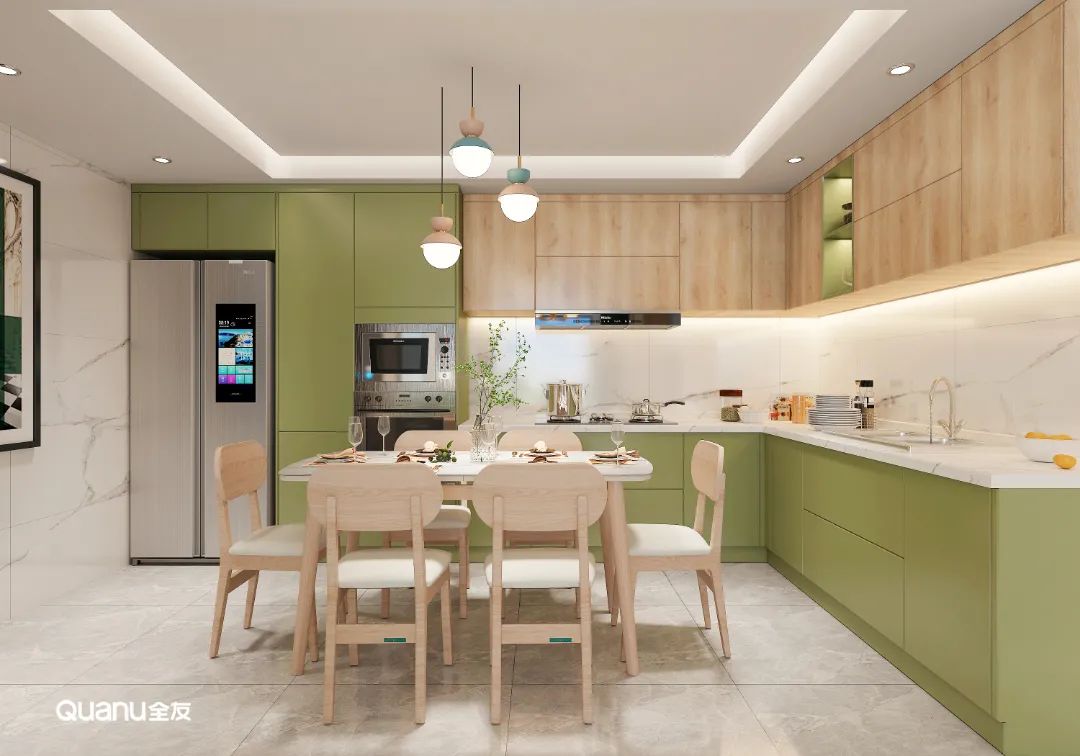 除了常見的白色、灰色和原木色,綠色也是廚房常見的顏色,而不同色調(diào)的綠色又可以營造出不一樣的烹飪氛圍。草綠色、豆綠色淡雅清新,不僅可以為被煙火氣包裹的廚房空間注入自然的活力,還有助于情緒的調(diào)節(jié)與放松,讓下廚更輕松自在。