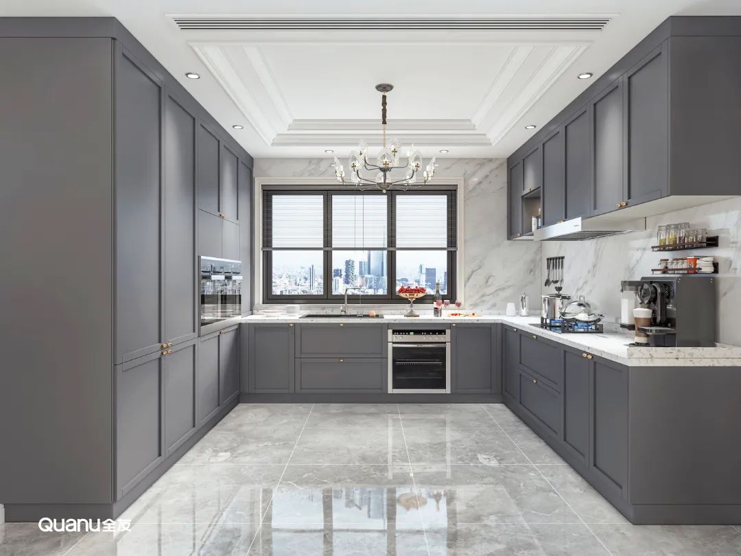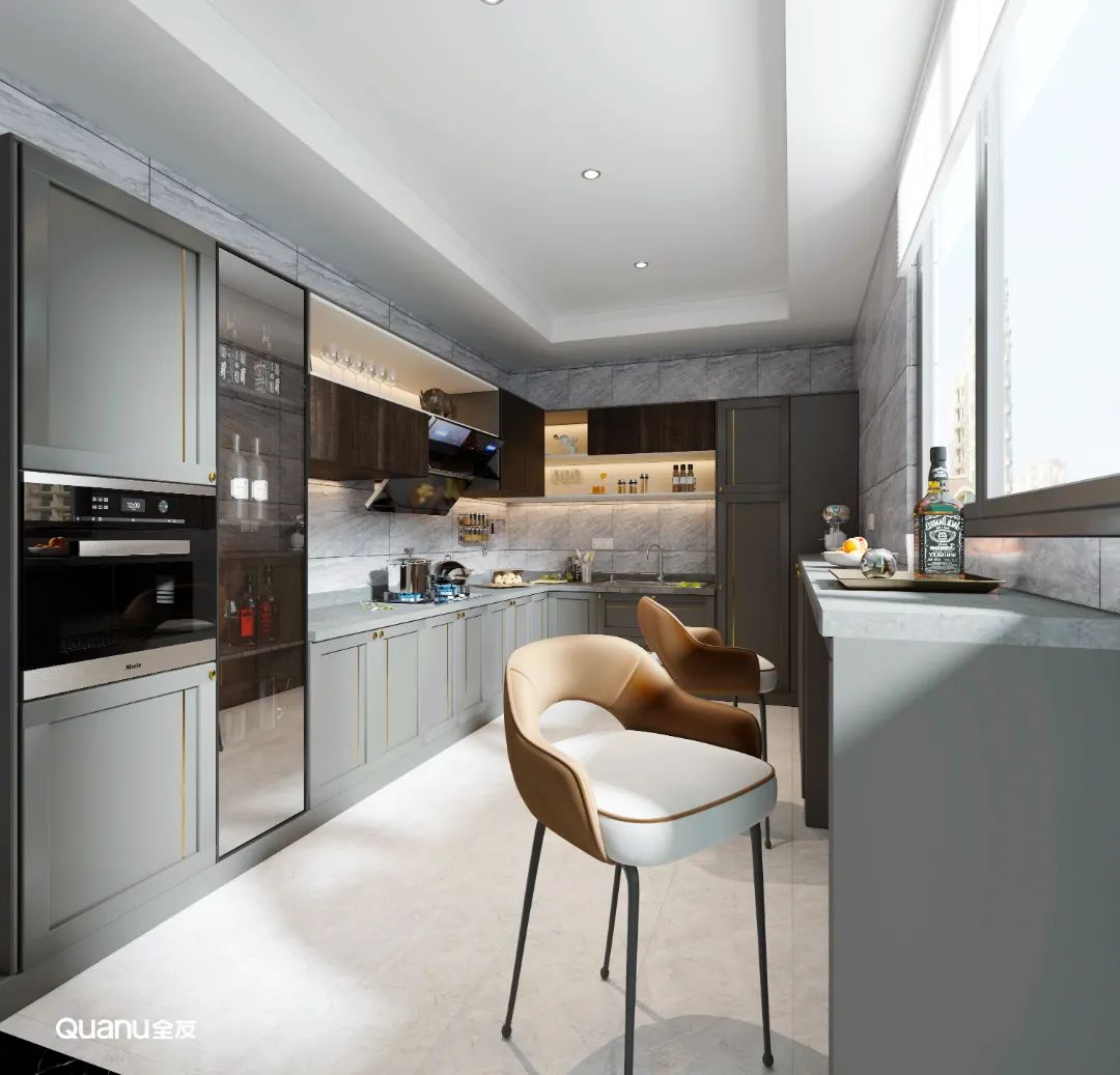 灰色時(shí)尚高級,現(xiàn)代感十足,用來裝飾廚房也是不錯(cuò)的選擇。大氣的冷色調(diào)構(gòu)筑了優(yōu)雅的視覺美感,把藝術(shù)格調(diào)表現(xiàn)得淋漓盡致,其呈現(xiàn)出來的高端質(zhì)感讓廚房更顯井然有序。相較于白色,灰色系廚房最大的優(yōu)勢就是耐臟,不管是塵土還是其它污漬,在灰色面前都不會(huì)太明顯。
